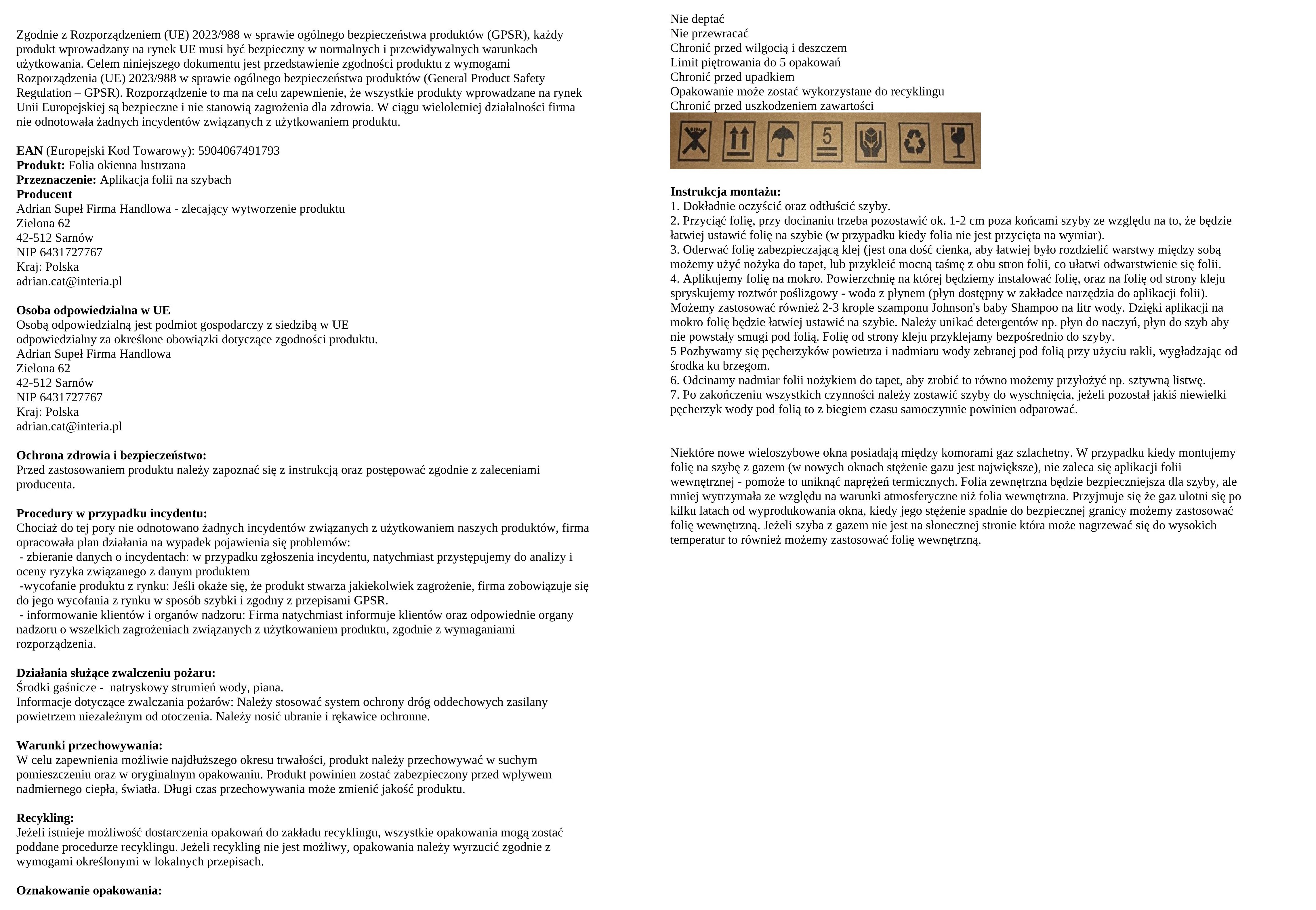 Folia okienna imitująca efekt lustra weneckiego. Folia lustrzana znajduje swoje zastosowanie w oknach mieszkań, domów, witryn sklepowych, biur i instytucji publicznych, urzędów, czy szyb samochodowych. Folia jest imitacją lustra weneckiego więc nie zatrzymuje w 100% odbitego światła tak jak działa typowe lustro weneckie, ale przepuszcza część światła i odbita część jest na tyle znaczna że powstały obraz w trakcie dnia przypomina wygląd zwykłego lustra. Folia posiada klej samoprzylepny po oderwaniu warstwy podkładowej, a aplikacja odbywa się na mokro zgodnie z instrukcją zamieszczoną w dolnej części opisu. Folia przepuszcza 65% światła słonecznego do pomieszczenia, to znaczy że wnętrze zostanie przyciemnione o 35%. Zaletą zaaplikowanej na szybie folią jest zabezpieczenie szkła przed skutkami otarć oraz zarysowań i zmniejszone ryzyko pęknięcia szyby. Folia zabezpiecza i wzmacnia szkło. Szkło pokryte folią staje się twardsze oraz bardziej odporne na drgania i naprężenia w ramach okiennych. W przypadku stłuczenia szyby, powierzchnia szkła chroni przed rozsypaniem się szkła i odłamków, co wpływa na bezpieczeństwo. Montaż folii okiennej doskonale sprawdzi się w celu ograniczenia o 99% szkodliwego promieniowania UV, odpowiedzialnego za odbarwianie i blaknięcie przedmiotów, czy pękanie foteli skórzanych. Pomieszczenie z zastosowaną folią okienną zmniejsza temperaturę ograniczając zużycie klimatyzacji, a także zwiększając komfort pracy. Folia posiada klej usuwalny w przypadku chęci zdemontowania jej z szyby - klej nie pozostawia negatywnych skutków dla szyby. Należy to zrobić przy użyciu wyższej temperatury suszarki bądź opalarki, a w przypadku gdy pozostaną resztki kleju, użyć benzyny ekstrakcyjnej.