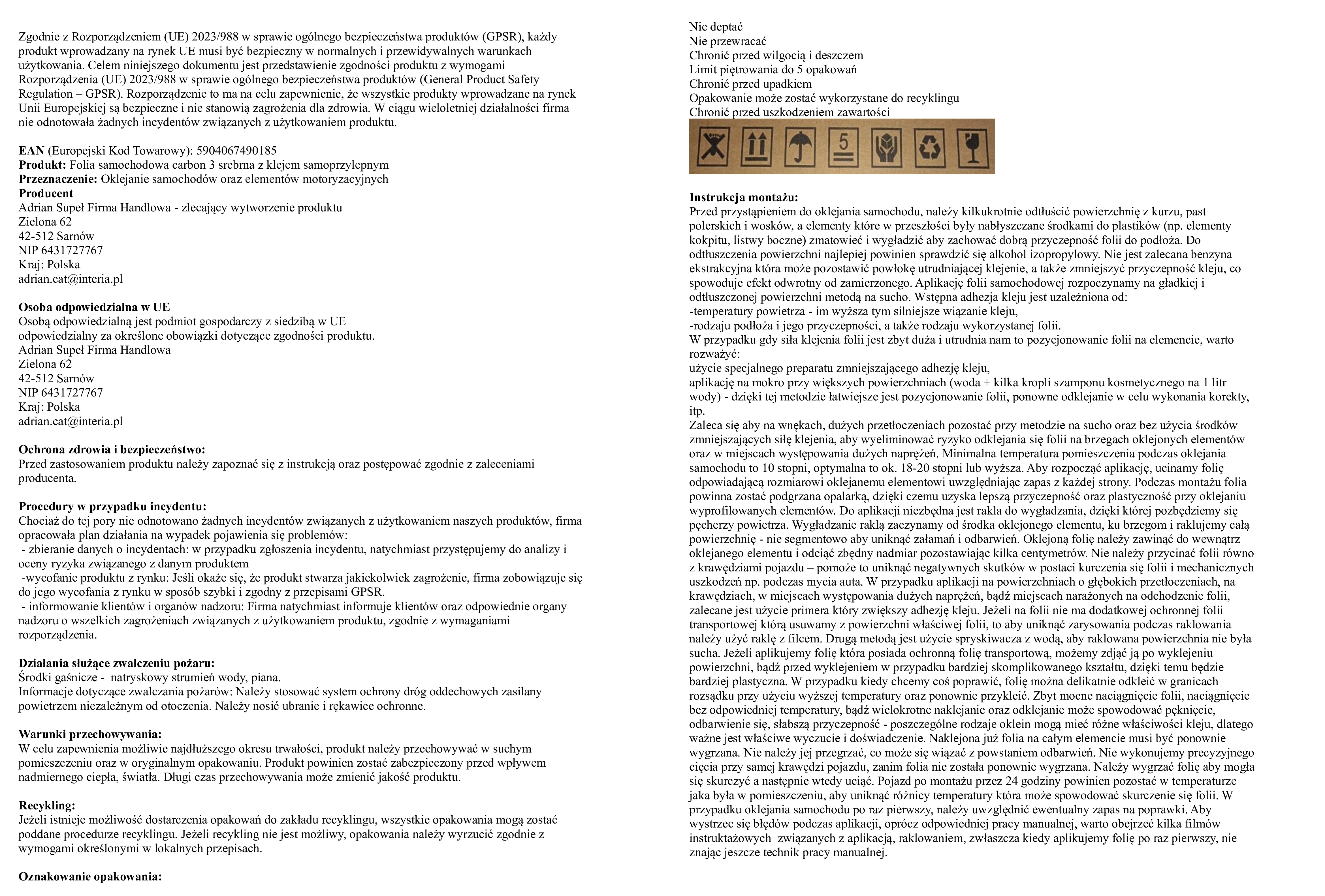 Samochodowa folia srebrna carbon 3d z wyczuwalną w dotyku strukturą carbonu. Folia posiada klej mikrokanalikowy, który ułatwia wyprowadzanie pęcherzyków powietrza podczas aplikacji, dzięki czemu aplikacja jest łatwiejsza i szybsza w porównaniu do folii ze zwykłym klejem. Folia jest termoplastyczna, idealnie nadaje się do zastosowania zewnętrznego - oklejania całych samochodów, a także zastosowania wewnętrznego jak dekoracyjne elementy kokpitu, deski rozdzielczej itp. W folii zastosowano mocny klej samoprzylepny, który zabezpiecza warstwa papieru podkładowego.