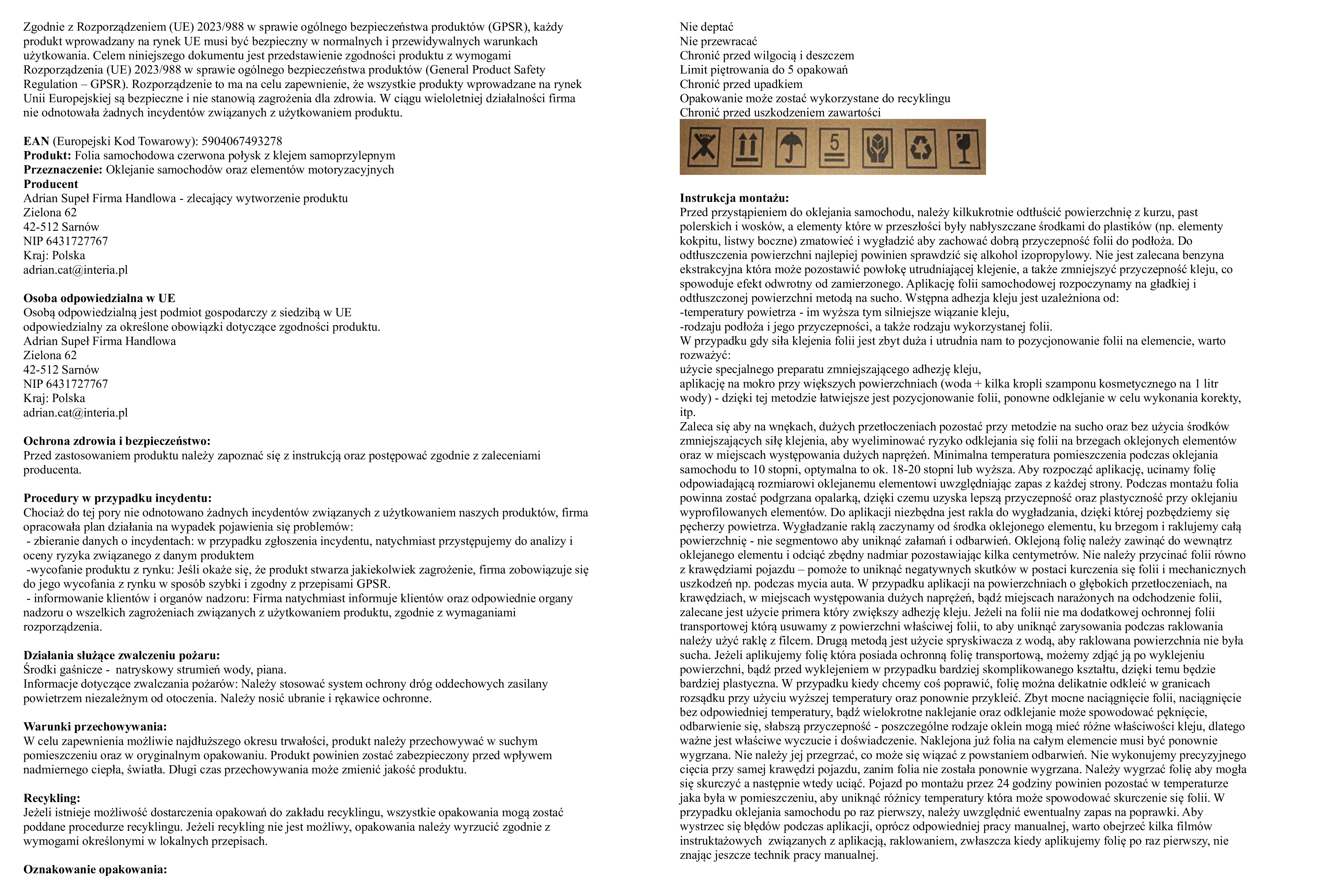 Samochodowa folia czerwona połysk. Folia posiada klej mikrokanalikowy, który ułatwia wyprowadzanie