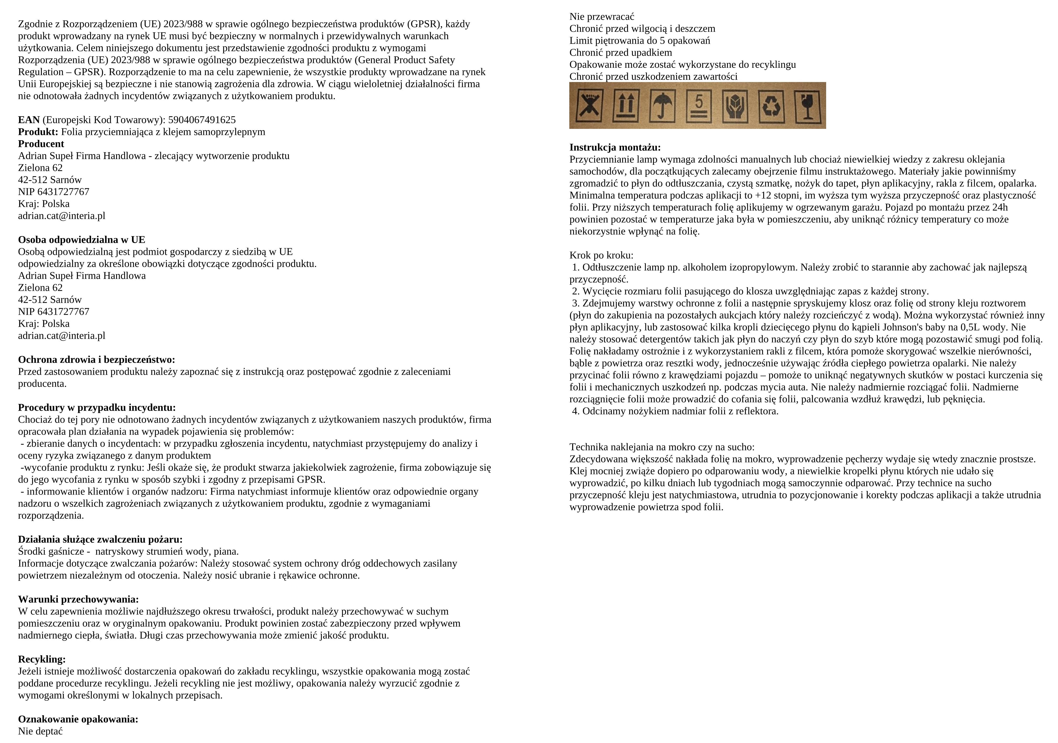 Termoplastyczna folia przyciemniająca do lamp. Folię nakleja się na zewnętrzną stronę lampy. Zaaplikowania folia na reflektorze minimalizuje ryzyko uszkodzenia lamp chroniąc je przed odpryskami, zarysowaniami, a także zmniejsza ryzyko matowienia lub żółknięcia lamp które pojawia się na lampach wraz z upływem lat - folia pochłania i redukuje ilość szkodliwego promieniowania, dzięki czemu lampy dłużej zachowują oryginalny wygląd. Folię w każdej chwili można zerwać i nadać pierwotny wygląd przy użyciu źródła ciepłego powietrza. Folia odporna jest na warunki atmosferyczne co pozwala użytkować ją przez długi okres. Aplikację folii wykonujemy w temperaturze powyżej kilkunastu stopni oraz przy użyciu opalarki, co wpłynie na plastyczność folii oraz wiązanie kleju (w dalszej części opisu instrukcja montażu krok po kroku).