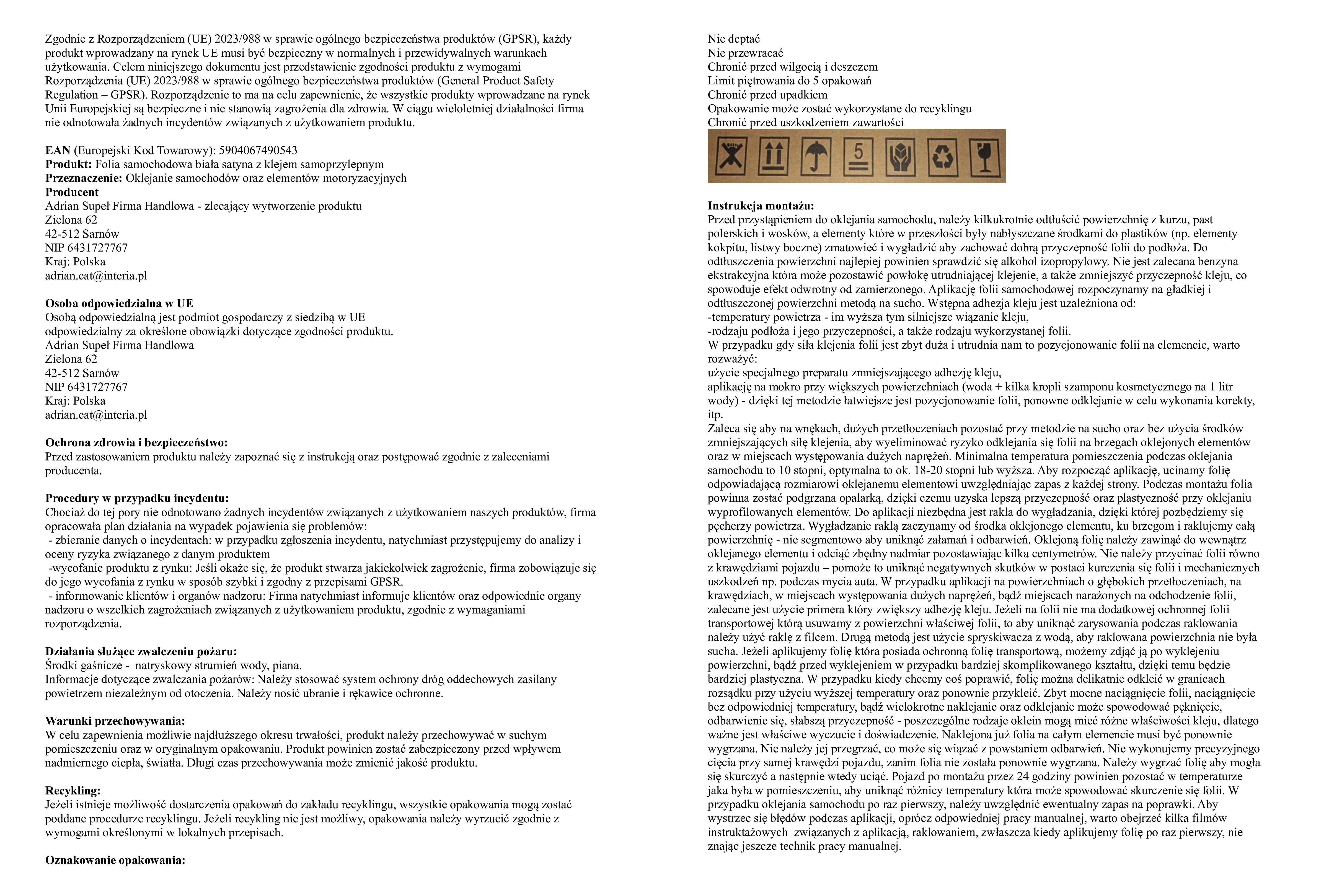 Samochodowa folia biała perła satyna. Folia posiada klej mikrokanalikowy, który ułatwia wyprowadzanie pęcherzyków powietrza podczas aplikacji, dzięki czemu aplikacja jest łatwiejsza i szybsza w porównaniu do folii ze zwykłym klejem. Folia jest termoplastyczna, idealnie nadaje się do zastosowania zewnętrznego - oklejania całych samochodów, a także zastosowania wewnętrznego jak dekoracyjne elementy kokpitu, deski rozdzielczej itp. W folii zastosowano mocny klej samoprzylepny, który zabezpiecza warstwa papieru podkładowego.