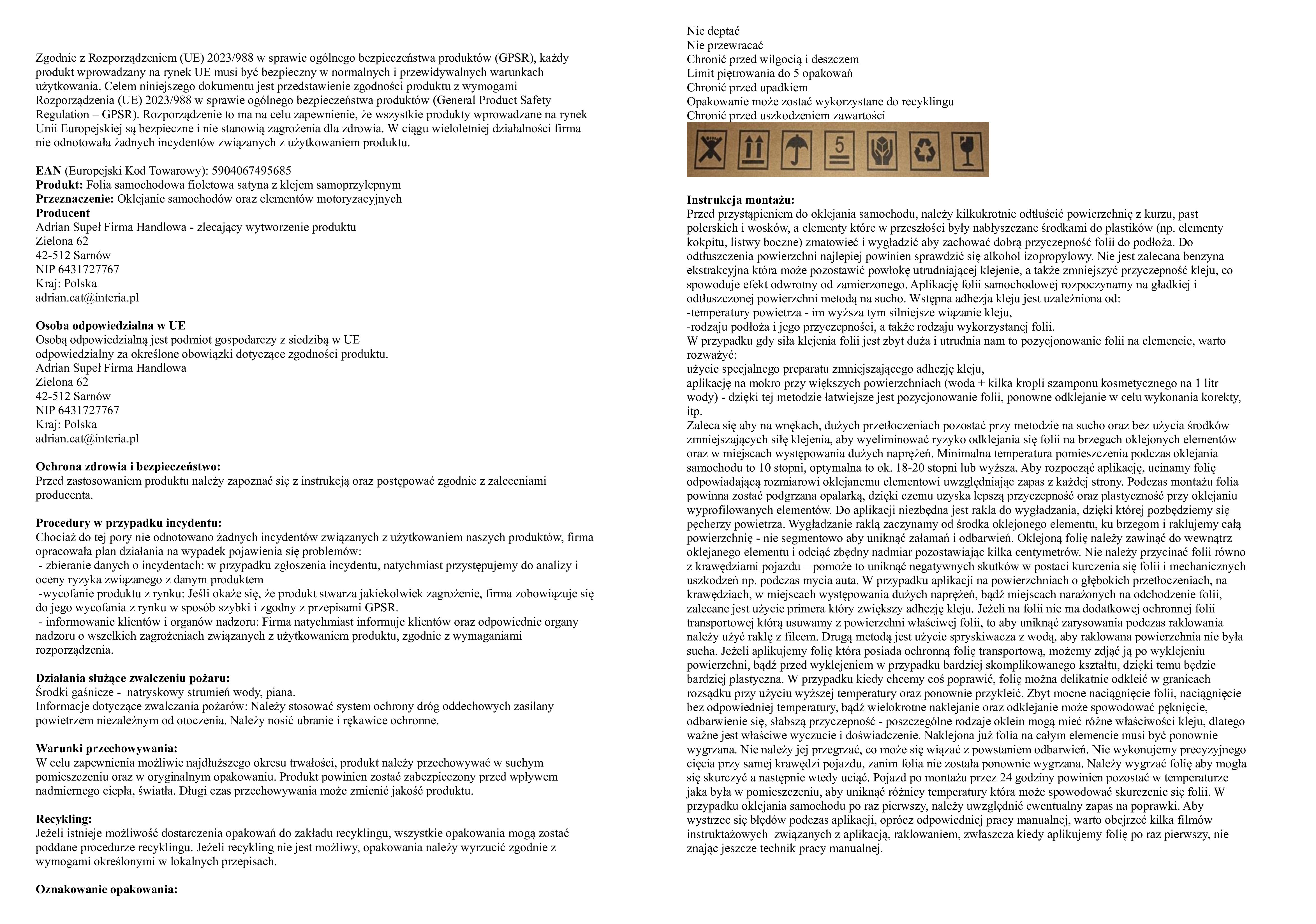 Samochodowa folia fioletowa satyna. Folia posiada klej mikrokanalikowy, który ułatwia wyprowadzanie