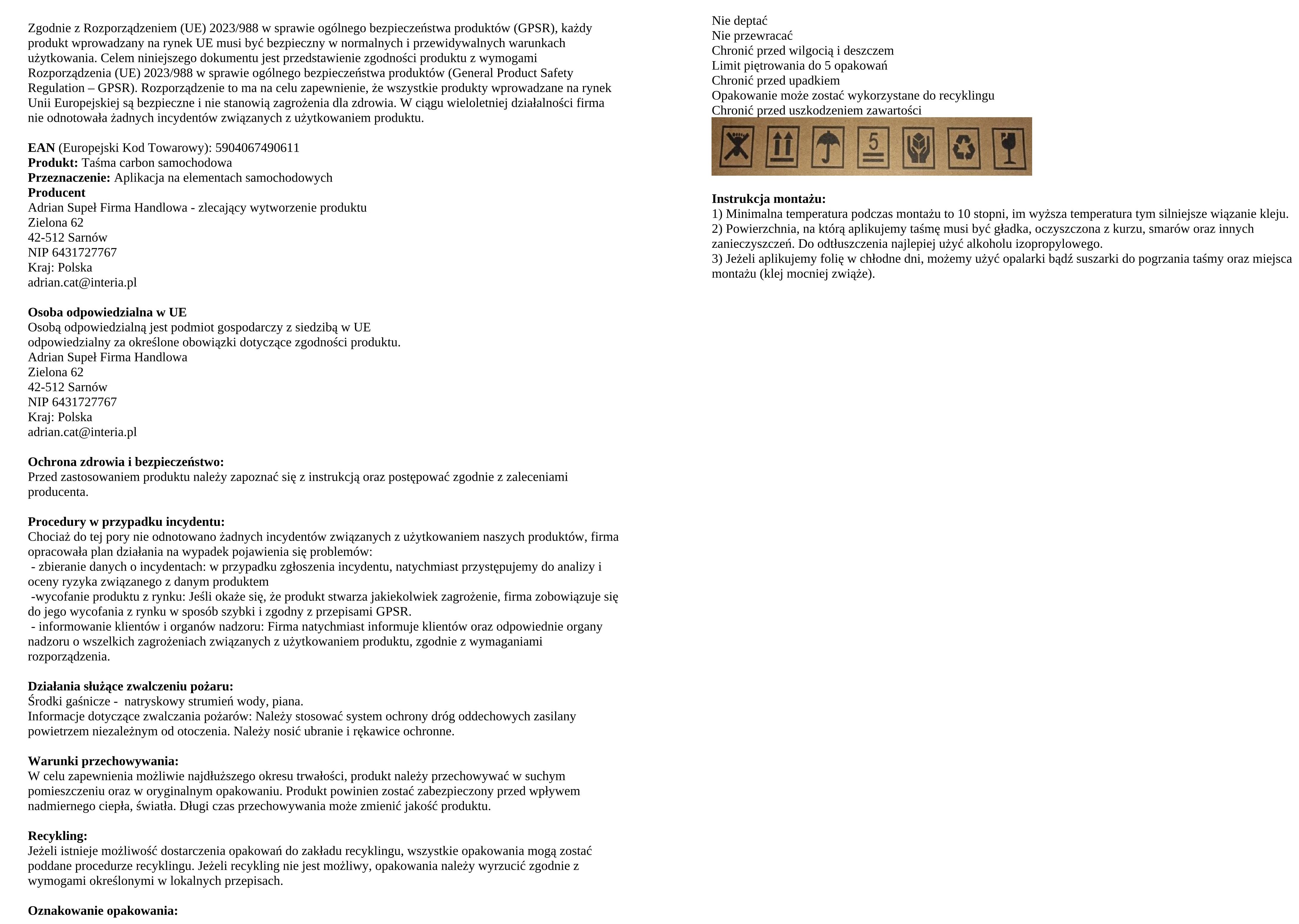 Samochodowa taśma połyskowa która imituje wykończenie carbon 5D. Wytrzymała i łatwa w montażu, nadaje się do zabezpieczania takich powierzchni jak progi samochodowe, zderzak pod klapą bagażnika, ranty drzwi itp. Taśma jest samoprzylepna i dwuwarstwowa (z dodatkową folią zabezpieczającą klej). Odporna jest na warunki atmosferyczne więc można stosować również na zewnątrz.